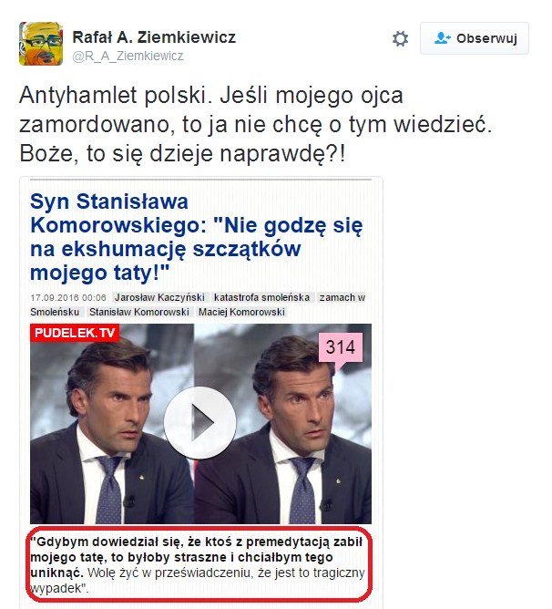 Na swoim twitterze Rafał A. Ziemkiewicz skomentował wypowiedź syna Stanisława Komorowskiego, który nie godzi się na ekshumację szczątków jego ojca. Młody Komorowski powiedział bowiem, że jeśli ktoś jego ojca zabił, to on woli... żyć w nieświadomości.