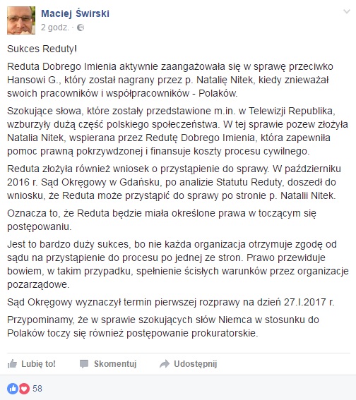 Maciej Świrski na swoim profilu na Facebooku opublikował post dotyczący sprawy Hansa G. i obrażania przez niego Polaków.