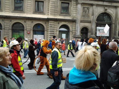 Na czele pochodu jedzie czerwon piętrowy autobus, z którego cały czas pozdrawiani są ludzie. Za nim idą bębniarze, klowni, ale także małpy z twarzami Tuska. Wszystkich jednoczy zaś jedno hasło: dość rządów Tuska.