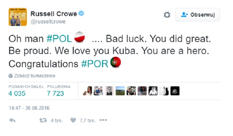 Aktor Russel Crowe napisał po meczu Polska - Portugalia:
