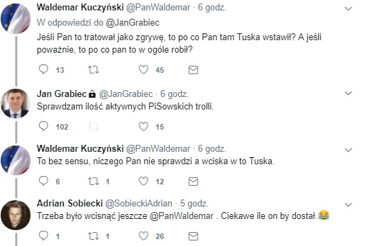 Celu publikacji przez polityka takiej sondy nie zrozumiał nawet Waldemar Kuczyński... Między posłem a piewcą KOD doszło do dość kuriozalnej wymiany zdań. Panie Pośle, "pisowskie trolle" to ludzie, którzy zagłosowali na Marka Suskiego czy Andrzeja Dudę? Druga sprawa, to że owe "pisowskie trolle" to nie mąka czy woda, ale ludzie, dlatego powinniśmy mówić o ich "liczbie", a nie "ilości"...