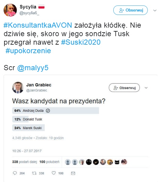 Teraz polityk postanowil pokazać ogromne poparcie internautów dla ewentualnej prezydentury Donalda Tuska (istnieje duże prawdopodobieństwo, że szef Rady Europejskiej w 2020 roku zawalczy o funkcję prezydenta RP), jak również zażartować z posła PiS, Marka Suskiego, który w rozmowie z portalem TelewizjaRepublika.pl mówił, jak wyglądałaby jego polityka, gdyby był głową państwa polskiego. Grabiec opublikował na Twitterze sondę, w której jednak coś chyba poszło bardzo nie tak...