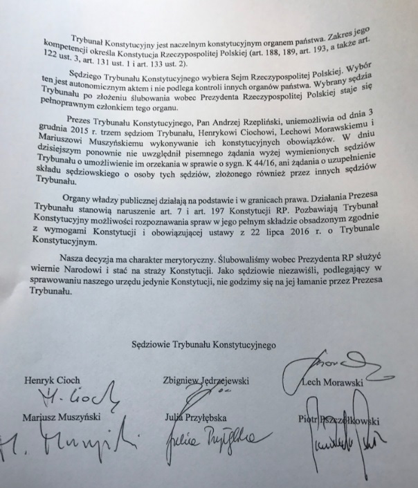Julia Przyłębska, Piotr Pszczółkowski i Zbigniew Jędrzejewski odmówili udziału w dzisiejszej rozprawie. W przekazanym dziennikarzom oświadczeniu piszą, że ich decyzja „ma charakter merytoryczny. Jako sędziowie niezawiśli, nie godzimy się na łamanie [konstytucji] przez Prezesa Trybunału”.
