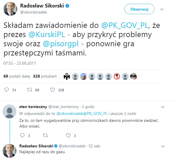 "Składam zawiadomienie do Prokuratury Krajowej, że prezes TVP Jacek Kurski, aby przykryć problemy swoje i PiS ponownie gra przestępczymi taśmami"- poinformował za pośrednictwem Twittera były szef polskiej dyplomacji, Radosław Sikorski.