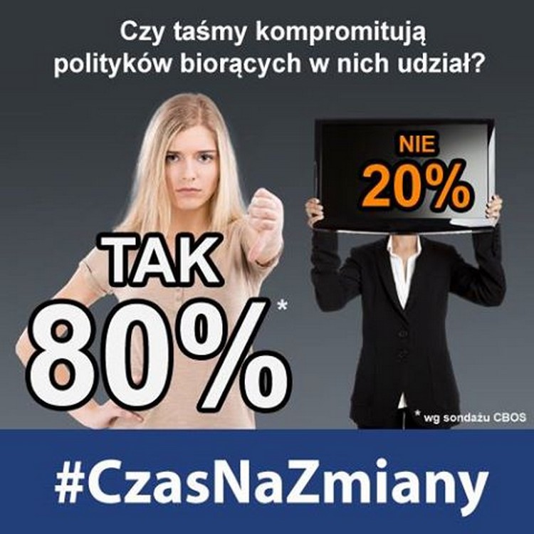 Dziś PiS opublikowało na swoim Facebooku dwa plakaty akcji "#CzasNaZmiany". Partia Jarosława Kaczyńskiego piętnuje na nich aferę taśmową. Pierwszy z nich, powołując się na dane CBOS-u, podkreśla, że "80% Polaków" uważa, iż "taśmy skompromitowały" nagranych polityków. Drugi bierze na cel ministra Bartłomieja Sienkiewicza - bohatera pierwszej z ujawnionych przez "Wprost" taśm.