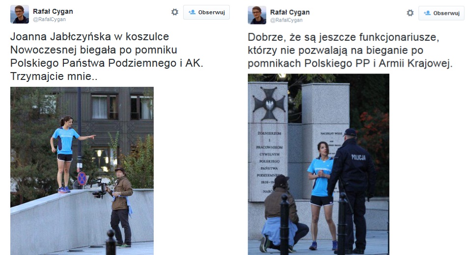 W Warszawie kręcono materiał wyborczy dla komitetu Ryszarda Petru. Nowoczesna zatrudniła do swojej reklamówki Joannę Jabłczyńską - aktorkę znaną z serialu "Na Wspólnej". Jabłczyńska przyodziana w strój sportowy, którego główną częścią była koszulka z logo Nowoczesnej, biegała po Warszawie, a dokładnie wesoło hasała po... pomniku Polski Podziemnej i Armii Krajowej.