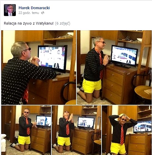 Podczas gdy znakomita część Polaków kierowała swoje oczy ku Watykanowi, gdzie świętym ogłoszony został Jan Paweł II, jeden z posłów Twojego Ruchu postanowił w specyficzny sposób „uczcić” kanonizację. Na swoim faceboowym profilu zamieścił zdjęcia, na których widać, jak klęczy przed telewizorem. Podpis? „Relacja na żywo z Watykanu!”. Parlamentarzysta szybko znalazł poparcie u kompanów palikociarzy. „Mistrzostwo świata Marek genialne” - chwalił Armand Ryfiński.
