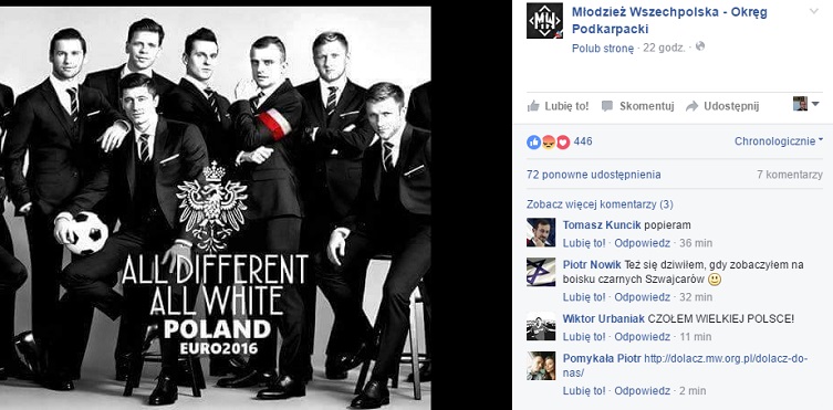 Młodzież Wszechpolska uznała jednak, że trzeba zmienić kolorystykę na czarno-białą oraz dodać Kamilowi Grosickiemu na ramieniu biało-czerwoną opaskę, a wszystko okrasić napisem: "All different, all white. Poland Euro 2016".