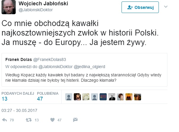 "Co mnie obchodzą kawałki najkosztowniejszych zwłok w historii Polski. Ja muszę - do Europy... Ja jestem żywy. Co mnie obchodzą kawałki najkosztowniejszych zwłok w historii Polski. Ja muszę - do Europy... Ja jestem żywy."- napisał na portalu społecznościowym.