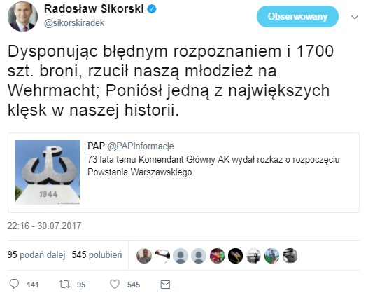 Jednocześnie, 1 sierpnia każdego roku o godzinie 17 cała Warszawa, dosłownie, staje w miejscu. Tylko były szef MSZ, Radosław Sikorski przy każdej rocznicy rzuca skandaliczne słowa o "katastrofie" i "samobójstwie".