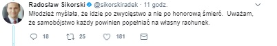 "Straty 100 żołnierzy i cywilów za każdego zabitego wroga to nie jest walka, a samoeksterminacja."- dyskutował dalej były szef MSZ.
