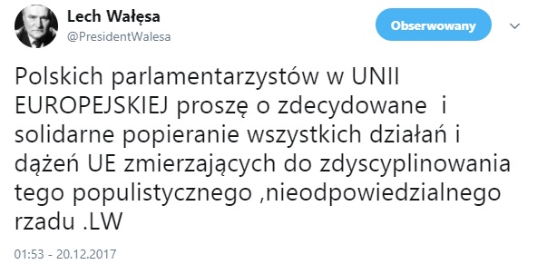Swoją opinię na ten temat wyraził m.in. były prezydent Lech Wałęsa, zamieszczając skandaliczny wpis na Twitterze. W swoim tweecie Wałęsa wezwał polskich europarlamentarzystów do "zdecydowanego i solidnego popierania wszystkich działań i dążeń" Brukseli, które mają "zdyscyplinować" rząd PiS, "populistyczny i nieodpowiedzialny".