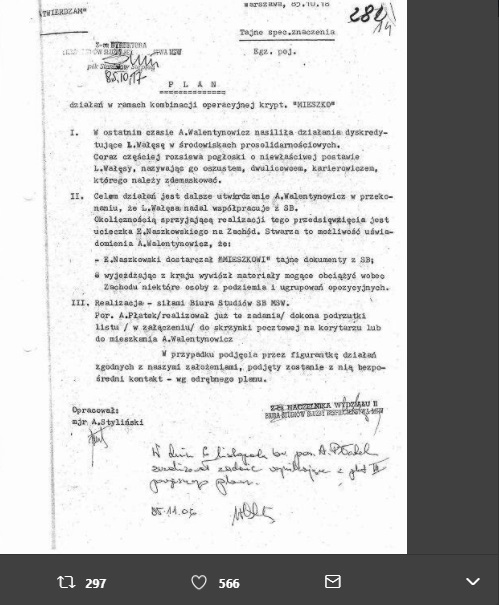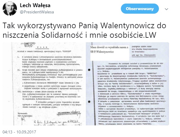W 89. miesięcznicę katastrofy smoleńskiej Lech Wałęsa opublikował na Twitterze skany dokumentów, z których ma wynikać, że SB posługiwała się takimi osobami jak tragicznie zmarła w tej katastrofie Anna Walentynowicz, aby zdyskredytować pierwszego przywódcę "Solidarności".