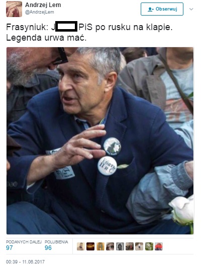 Internautom udało się wypatrzeć w klapie marynarki Frasyniuka znaczek z napisem "J**** PiS", w dodatku... cyrylicą. To jeszcze nic. Późnym wieczorem, podczas krótkiej konferencji prasowej, zaatakował personalnie prezesa PiS, Jarosława Kaczyńskiego.