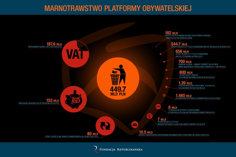 Z raportu Fundacji Republikańskiej wynika, że "Rząd PO-PSL zmarnował w ciągu ośmiu lat blisko 450 mld zł. Takie wyliczenie przedstawiła Fundacja Republikańska na podstawie, m.in. raportów NIK-u. Największymi składnikami tak wysokiej sumy jest 187,6 mld zł straty pochodzącej z wyłudzeń podatku VAT i 153 mld zł – z wirtualnego zasilenia ZUS-u ze środków OFE w 2014 r. Na mapie marnotrawstwa PO, Fundacja umieściła też, m.in. wzrost nakładów na administrację publiczną w wysokości 10,5 mld zł w latach 2008-12, prawie 1,5 mld zł na budowę nieefektywnej e-administracji od 2012 r. i 1,2 mld na budowę stadionu narodowego.".