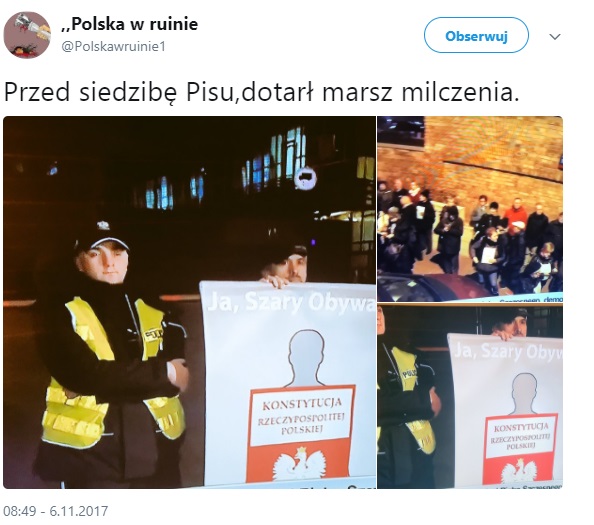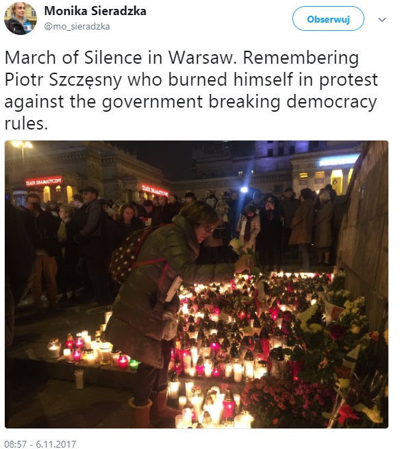 W poniedziałek o 16:30 spod Pałacu Kultury i Nauki wyruszył "Marsz Milczenia" mający upamiętnić zmarłego niedawno Piotra Szczęsnego- mężczyznę, który 19 października dokonał samospalenia na Pl. Defilad w centrum Warszawy.