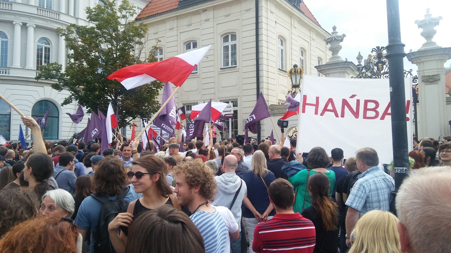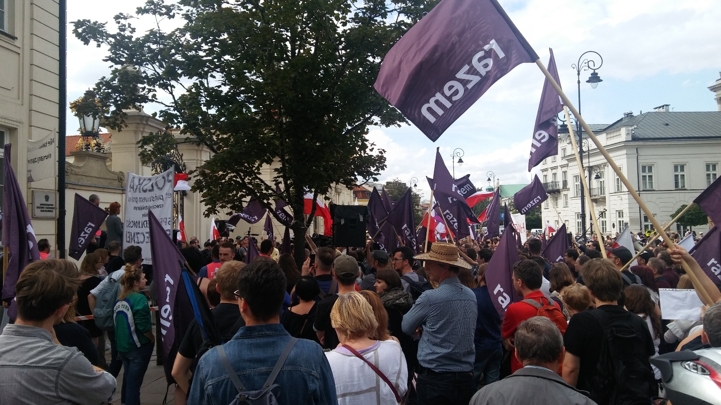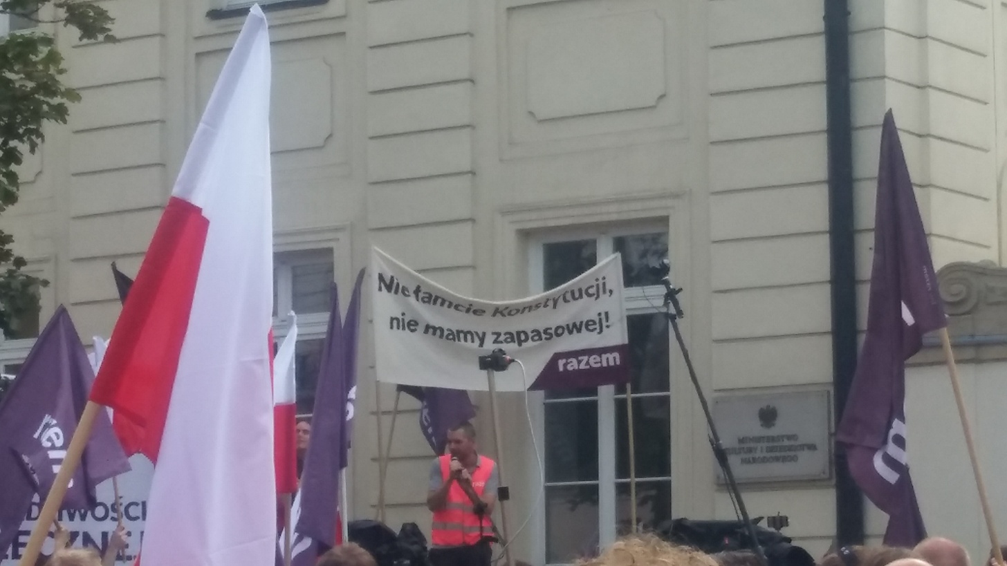 W sobotę o godz. 15.00 przed Pałacem Prezydenckim rozpoczęła się manifestacja organizowana przez partię Razem, na czele z jej liderem, Adrianem Zandbergiem. Manifestacja wymierzona była przeciw zmianom w sądownictwie, uchwalonym przez sejm i dominowały na niej hasła wieszczące koniec demokracji pod rządami Prawa i Sprawiedliwości.