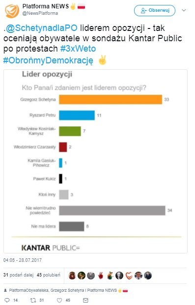 Platforma Obywatelska zdążyła jednak odtrąbić sukces, ponieważ poza opcją "Trudno powiedzieć" wygrywa Grzegorz Schetyna z 33-procentowym wynikiem. Dla zaledwie 11 procent respondentów liderem opozycji jest Ryszard Petru. O 4 pp. mniej zdobył przewodniczący PSL, Władysław Kosiniak-Kamysz.
