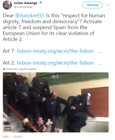 "Drogi Jean Claude-Juncker. Czy to jest „respektowanie praw ludzkiej godności, wolności i demokracji”? Aktywujcie art. 7, by zawiesić Hiszpanię w Unii Europejskiej za jawne pogwałcenie artykułu 2"- napisał na Twitterze Assange.