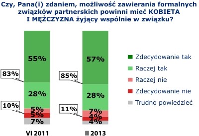 Ogólnie rzecz biorąc, 35% badanych aprobuje legalizację związków partnerskich niezależnie od płci osób zainteresowanych ich zawarciem, nieco ponad połowa (53%) dopuszcza ich zawieranie wyłącznie przez pary heteroseksualne, a co dziewiąty respondent (11%) w ogóle ich nie akceptuje – niezależnie od tego, czy miałyby je zawierać osoby tej samej czy różnej płci.