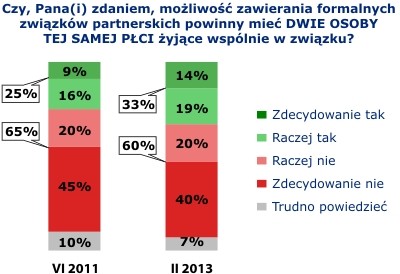 Od 2011 roku nie zmieniło się poparcie dla legalizacji heteroseksualnych związków partnerskich, wzrosła natomiast aprobata formalnych związków par tej samej płci, a tym samym pełne poparcie dla wprowadzenia takiego prawa.