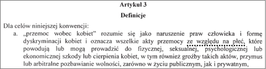 Nie trzeba znać angielskiego by dostrzec, że w oryginale chodzi o akty przemocy ze względu na gender, a nie ze względu na płeć (płeć biologiczna to po angielsku sex). Czy to robi różnicę? Art. 3c. mówi wyraźnie czym jest ów gender, czyli tzw. płeć społeczno-kulturowa (punkt c. pokazujemy wraz z nagłówkiem całego artykułu):