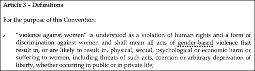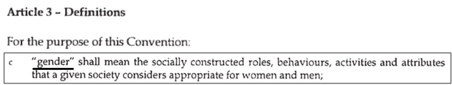 Widać, że definicja ta nie dotyczy aktów przemocy ze względu na biologiczne cechy kobiet, ale akty przemocy ze względu na społecznie skonstruowane role, zachowania...itd. Nie chodzi więc o przemoc wobec kobiet, ale wobec osób, które tylko odgrywają rolę kobiet swoim zachowaniem i umownymi atrybutami, a ściślej przemoc ze względu na owe zachowania, odgrywane role i umowne kobiece atrybuty. Zgodnie z tą definicją, przemoc ze względu na płeć w ogóle nie wchodzi w obszar zainteresowań konwencji!