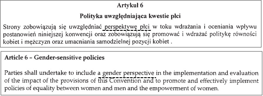 Jednak artykuł 6 mówi, że w toku wdrażania konwencji strony zobowiązują się uwzględniać perspektywę gender. Tu znowu mamy błędne tłumaczenie, które ukrywa ten istotny fakt. Polski test mówi, że strony zobowiązują się uwzględniać perspektywę płci (biologicznej). To oszustwo, bo mają uwzględniać perspektywę gender. Oto polska i angielska wersja artykułu 6. (podkreślenie GS):
