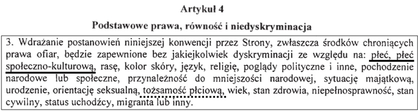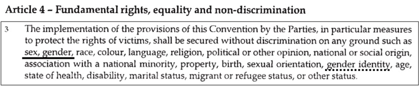 Taka definicja nie dziwi, ponieważ rzekomo dotycząca kobiet konwencja w ogóle płcią się nie zajmuje. O płci mówi tylko raz, stwierdzając, że nie wolno dyskryminować (uwaga!) ze względu na płeć i gender. Popatrzmy: