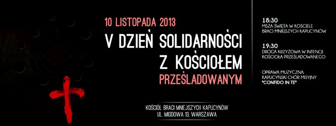 10 listopada 2013 roku obchodzimy V Dzień Solidarności z Kościołem Prześladowanym. Z tej okazji w kościele Braci Mniejszych Kapucynów przy ul. Miodowej 13 w Warszawie rozpocznie się Msza święta o godz. 18.30, a po niej droga krzyżowa z oprawą muzyczną Kapucyńskiego Chóru Misyjnego „Confido in Te”. Mszy będzie przewodniczył ks. Tomasz Atłas, dyrektor Papieskich Dzieł Misyjnych, a okolicznościowe kazanie wygłosi wygłosi Biskup Hyacinth Egbebo z Wikariatu Apostolskiego Bomadi w Nigerii.