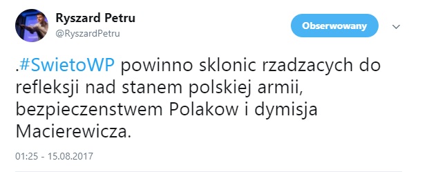 "Święto Wojska Polskiego powinno skłonić rządzących do refleksji nad stanem polskiej armii, bezpieczeństwem Polaków i dymisją Macierewicza"- napisał na Twitterze lider Nowoczesnej, w kolejnym tweecie przypominając z kolei słowa gen. Mirosława Różańskiego, byłego dowódcy generalnego RSZ, który zalecał żołnierzom "lekturę konstytucji i ustaw".