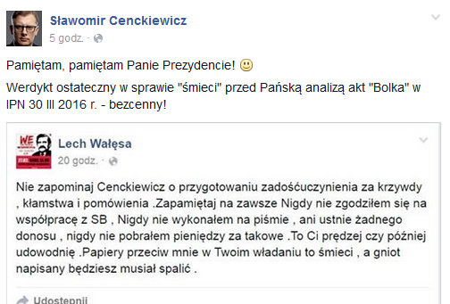 Na swoim Facebooku Lech Wałęsa popstanowił znowu zaatakować historyka Sławomira Cenckiewicza. Napisał: "Nie zapominaj Cenckiewicz o przygotowaniu zadośćuczynienia za krzywdy , kłamstwa i pomówienia .Zapamiętaj na zawsze Nigdy nie zgodziłem się na współpracę z SB , Nigdy nie wykonałem na piśmie , ani ustnie żadnego donosu , nigdy nie pobrałem pieniędzy za takowe .To Ci prędzej czy później udowodnię .Papiery przeciw mnie w Twoim władaniu to śmieci , a gniot napisany będziesz musiał spalić."