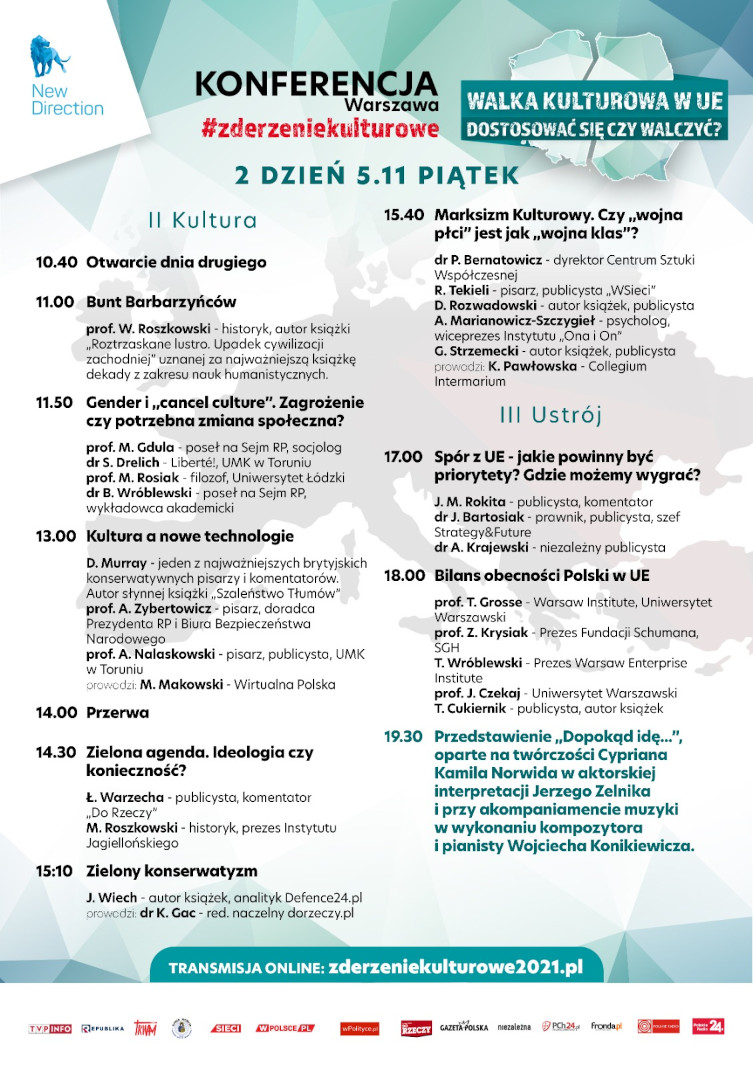 Zapraszany do śledzenia transmisji na stronie: www.zderzeniekulturowe2021.pl. Konferencję można też śledzić w mediach społecznościowych europosła Patryka Jakiego: na Facebooku i YouTube.