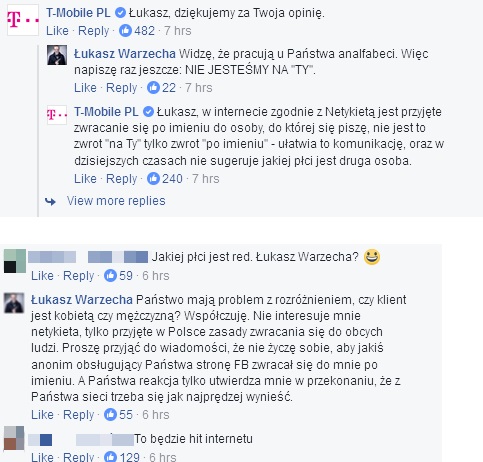 To jednak nie był koniec. Krytykowana przez Warzechę sieć T-Mobile odpowiedziała na krytykę, jednak sposób w jaki uczynili to ludzie prowadzący fanpage sieci, jeszcze bardziej rozsierdził dziennikarza, jako że wcześniej prosił, by w razie ewentualnej odpowiedzi nie zwracać się do niego per "Ty". Oto zapis rzeczonej wymiany zdań.