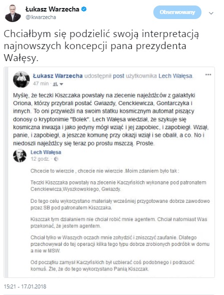 „Myślę, że teczki Kiszczaka powstały na zlecenie najeźdźców z galaktyki Oriona, którzy przybrali postać Gwiazdy, Cenckiewicza, Gontarczyka i innych i przywieźli na swoim statku kosmicznym automat piszący donosy o kryptonimie Bolek”- napisał na Twitterze Łukasz Warzecha.