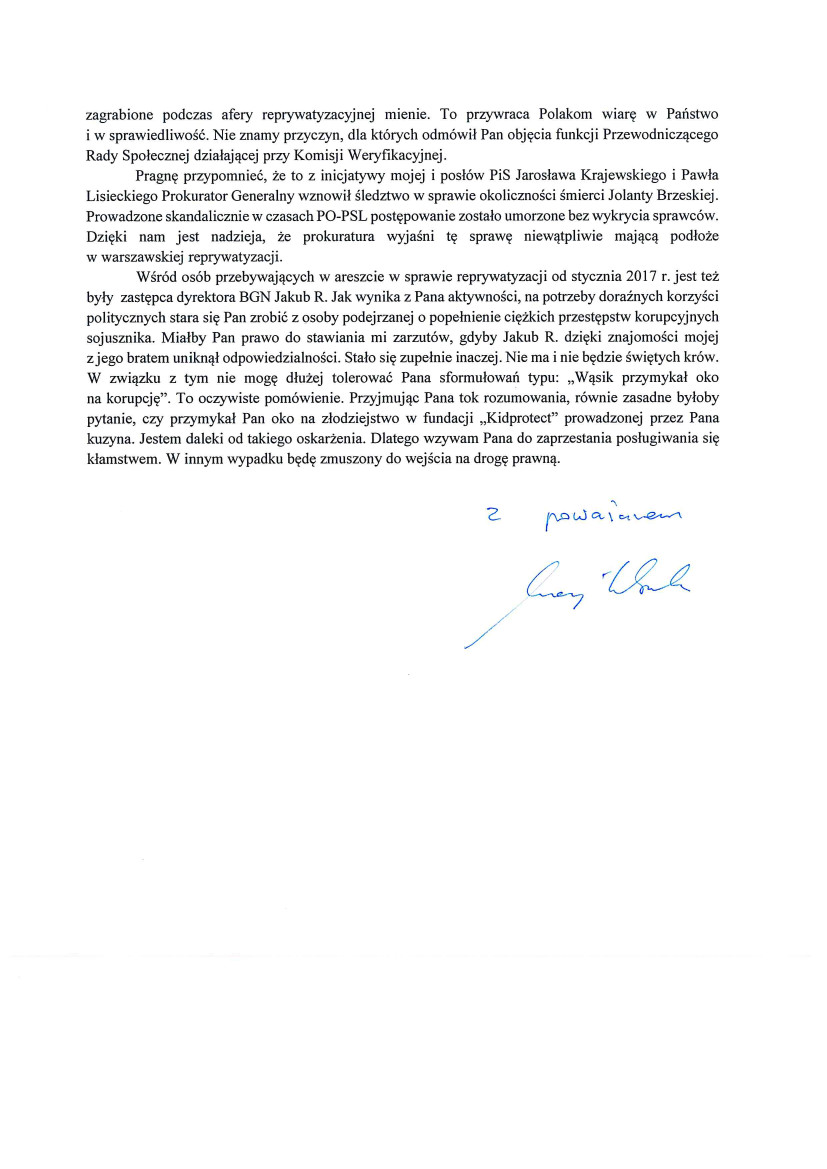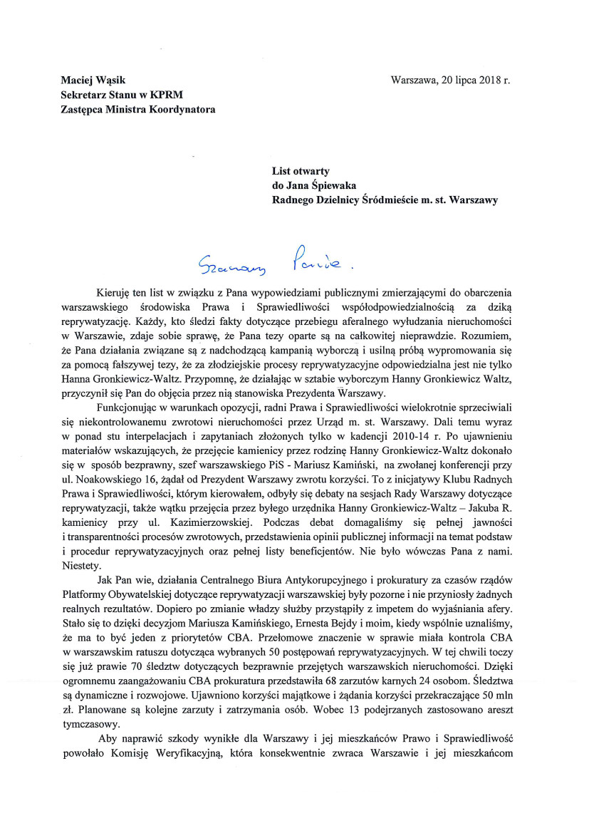 Odnosi się w nim do niedawnych wypowiedzi Śpiewaka i przypomina mu między innymi, że PiS konsekwentnie sprzeciwiało się „niekontrolowanemu zwrotowi nieruchomości” przez urząd miasta Warszawy. Tu wskazuje też: