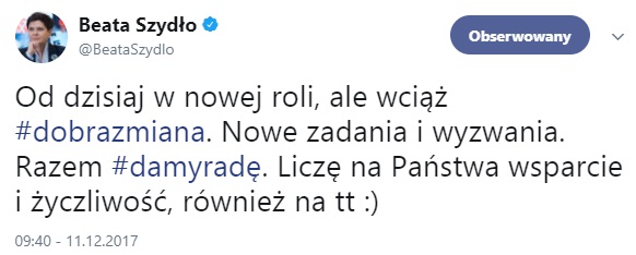 Jak była premier skomentowała na Twitterze swoją nową rolę?