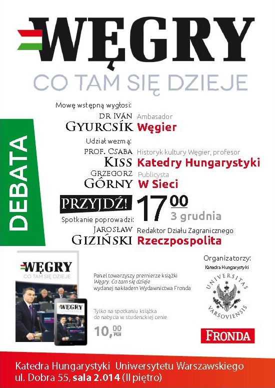 Panel towarzyszy premierze książki „Węgry. Co tam się dzieje” wydanej nakładem Wydawnictwa Fronda. Organizatorami spotkania są: Katedra Hungarystyki Uniwersytetu Warszawskiego oraz Wydawnictwo Fronda.