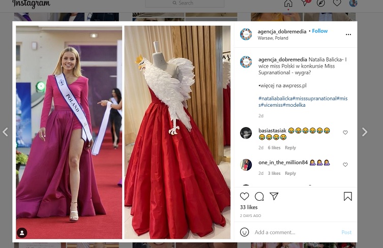 - Korona Miss Supranational trafiła do 23-letniej Miss Namibii Chanique Rabe, ale o naszej reprezentantce też zrobiło się bardzo głośno. Wszystko za sprawą oryginalnej kreacji, jaką Natalia Balicka miała na sobie podczas wyjścia na pokaz w strojach, które były inspirowane narodowymi symbolami. Piękna 21-latka wyszła na scenę w czerwonej, rozkloszowanej sukni, której góra ozdobiona była symbolem białego orła – pisze o tym portal fakt.pl