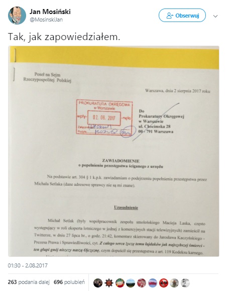 Michał Setlak, były współpracownik zespołu smoleńskiego Macieja Laska, niedawno w swoim wpisie na Twitterze życzył śmierci prezesowi PiS. Dziś doczekał się zawiadomienia do prokuratury.