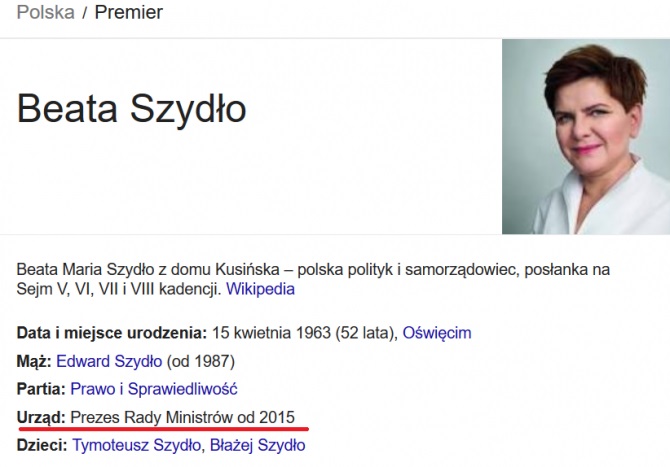 Według wyszukiwarki premierem jest już kandydatka PiS. W biogramie Beaty Szydło ukazującym się po wpisaniu w wyszukiwarkę hasła "premier Polski" możemy przeczytać, że jest "Prezesem Rady Ministrów od 2015 r."