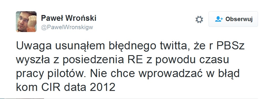 Decyzja premiera podyktowana była otrzymaną od kapitana załogi informacją, że start rządowego samolotu może nastąpić nie później niż o godzinie 1:30 w związku z zagrożeniem przekroczenia czasu pracy załogi samolotu" – to właśnie tego komunikatu dotyczył tweet Pawła Wrońskiego, dziennikarza "Gazety Wyborczej".