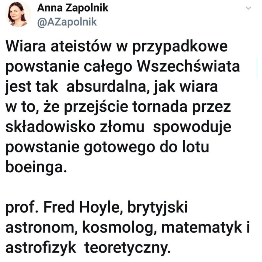- „Wiara ateistów w przypadkowe powstanie całego Wszechświata jest tak absurdalna, jak wiara w to, że przejście tornada przez składowisko złomu spowoduje powstanie gotowego do lotu boeinga”.