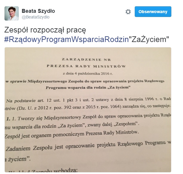 Premier Beata Szydło właśnie poinformowała na Twitterze, że powołała zespół, który będzie pracował nad rządowym programem "Za życiem".