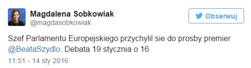 Jak poinformowała na Twitterze korespondentka „Wiadomości” TVP w Brukseli Magdalena Sobkowiak, Martin Schulz przychylił się do prośby premier Szydło, z którą przewodniczący PE rozmawiał dziś rano, by debata w Strasburgu o sytuacji w Polsce odbyła się 19 stycznia. Start: godz. 16:00.