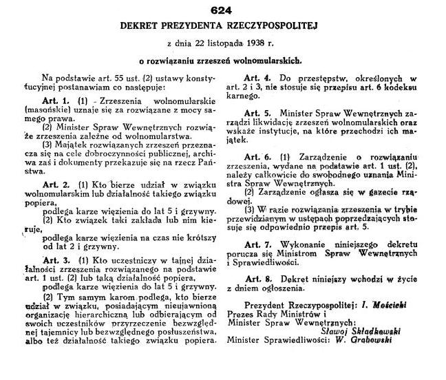 Prezydent Ignacy Mościcki 22 listopada 1938 roku wydał dekret o "rozwiązaniu zrzeszeń wolnomularskich". Poniżej przypominamy treść dekretu, który zakładał kary więzienia organizatorów i członków lóż masońskich.