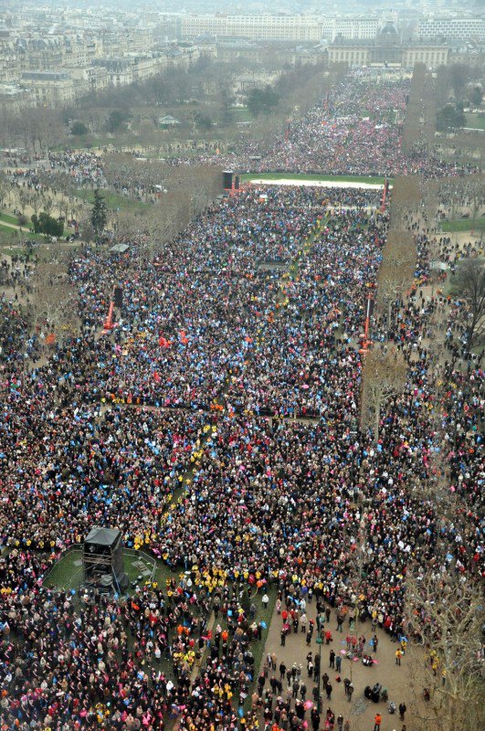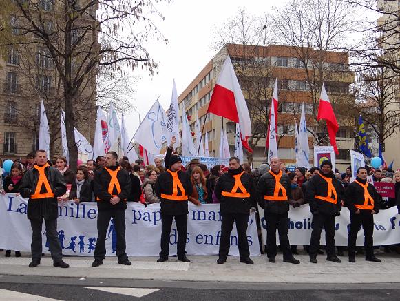 Uczestnicy manifestacji zebrali się o godz. 13.00 na trzech odległych od siebie placach Paryża, by w jednym miejscu spotkać się i dotrzeć wspólnie do Pól Marcowych niedaleko Wieży Eiffla. Jest godz. 17.00, a od organizatorów dowiadujemy się, że niestety ze względu na ogromną ilość uczestników i zablokowanie części miasta, nie możemy wyruszyć z Placu Pinel. Już ponad cztery godziny uczestnicy wznoszą głośne okrzyki wyrażające swój sprzeciw wobec planowanej ustawie. Wspólnie odmówiony różaniec oraz skandowane hasła: „Francja za normalną rodziną”, „Mąż i żona – mężczyzna i kobieta”, „Nie! Dla małżeństwa jednej płci”, transparenty, plakaty i banery oddają klimat manifestacji, która wokół siebie gromadzi nie tylko całe rodziny i środowiska katolickie, ale pojedynczych ludzi - informuje Joanna Szałata, Katolickie Stowarzyszenie „Civitas Christiana” w Szczecinie.